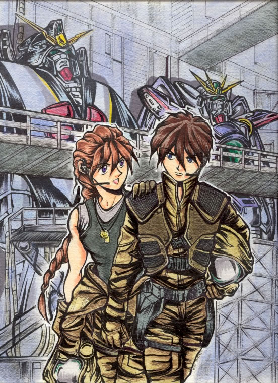 Heero and Duo in Battlestar Galactica flightsuits